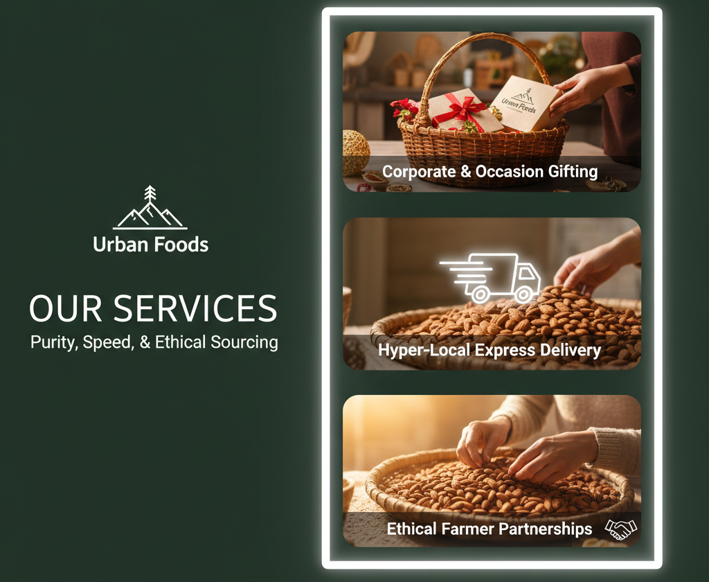 At Urban Foods, we do more than just sell premium dry fruits and spices. We provide a bridge between the traditional orchards of Shopian and your modern lifestyle. Our services are built on the foundations of purity, speed, and ethical sourcing.
